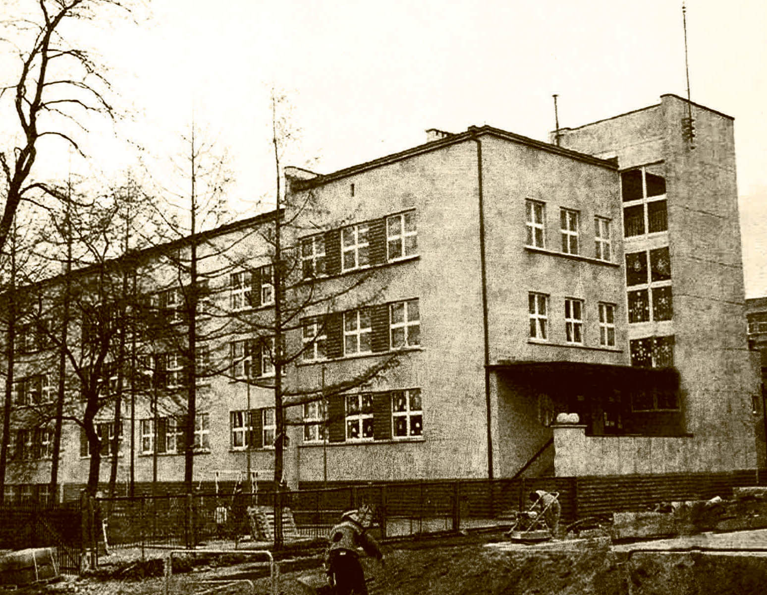 The modernist school building was opened in August 1939. The dynamic character, typical of modernism, was achieved by contrasting the horizontal with the vertical sections of the building and by the use of glazing. The staircase, with its decorative gable and rounded corners, crowned with a flag mast, is also worth noticing. |