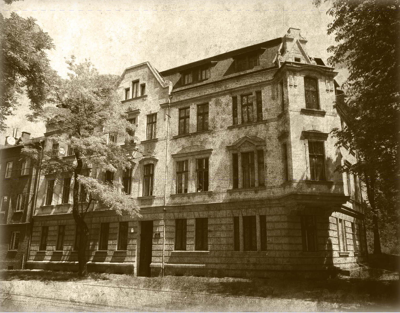 Das Eckstadthaus wurde im eklektischen Stil mit den Jugenstilelementenca. 1900 gebaut. Die Außenfassade wird mit den charakteristischen weißen glasierten Ziegeln versehen |