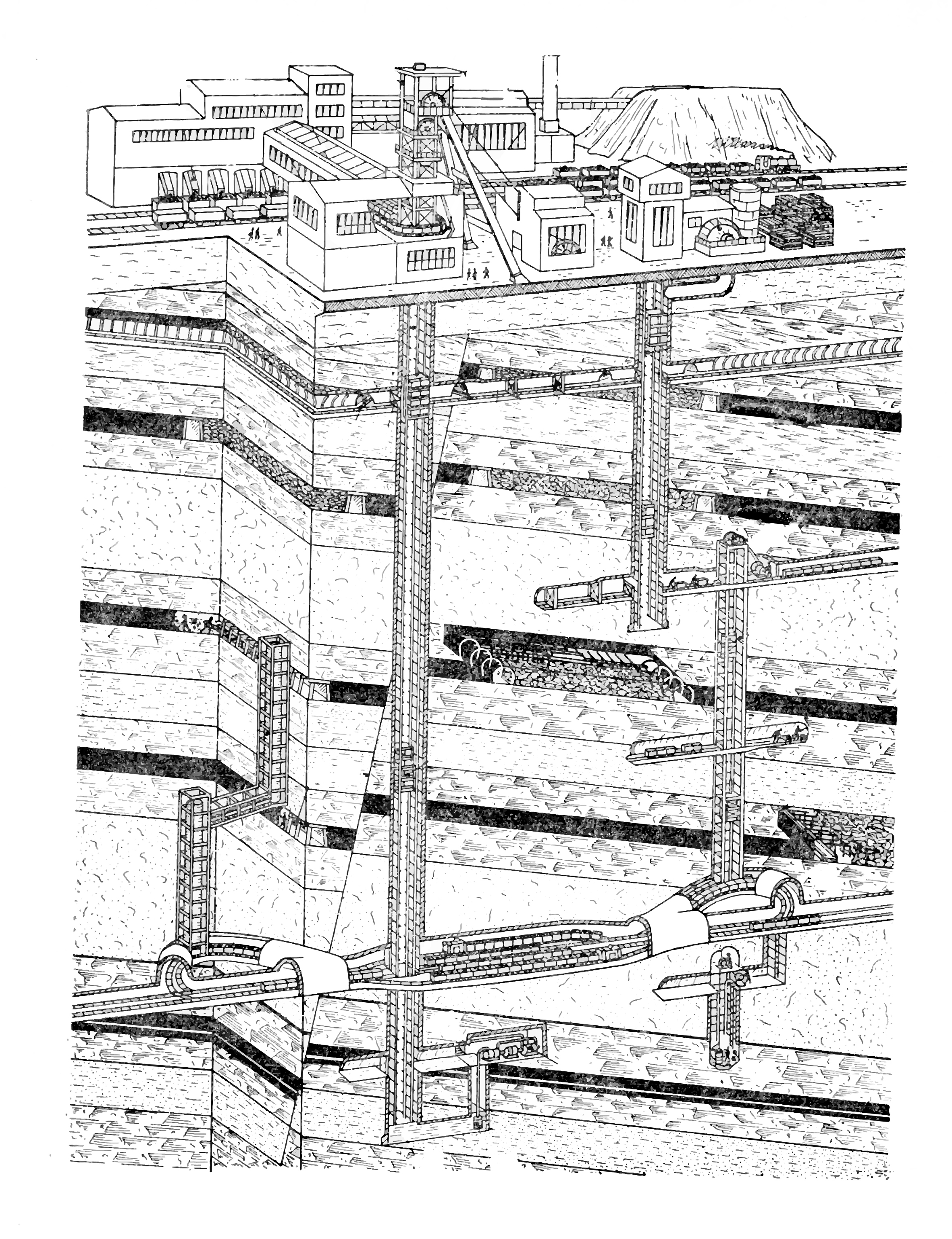 cross-section of a coal mine (from the book Chemiczna Technologia Węgla (Chemical Coal Technology) by Błażej Roga and Kazimierza Tomków, WNT, 1971, p. 164)