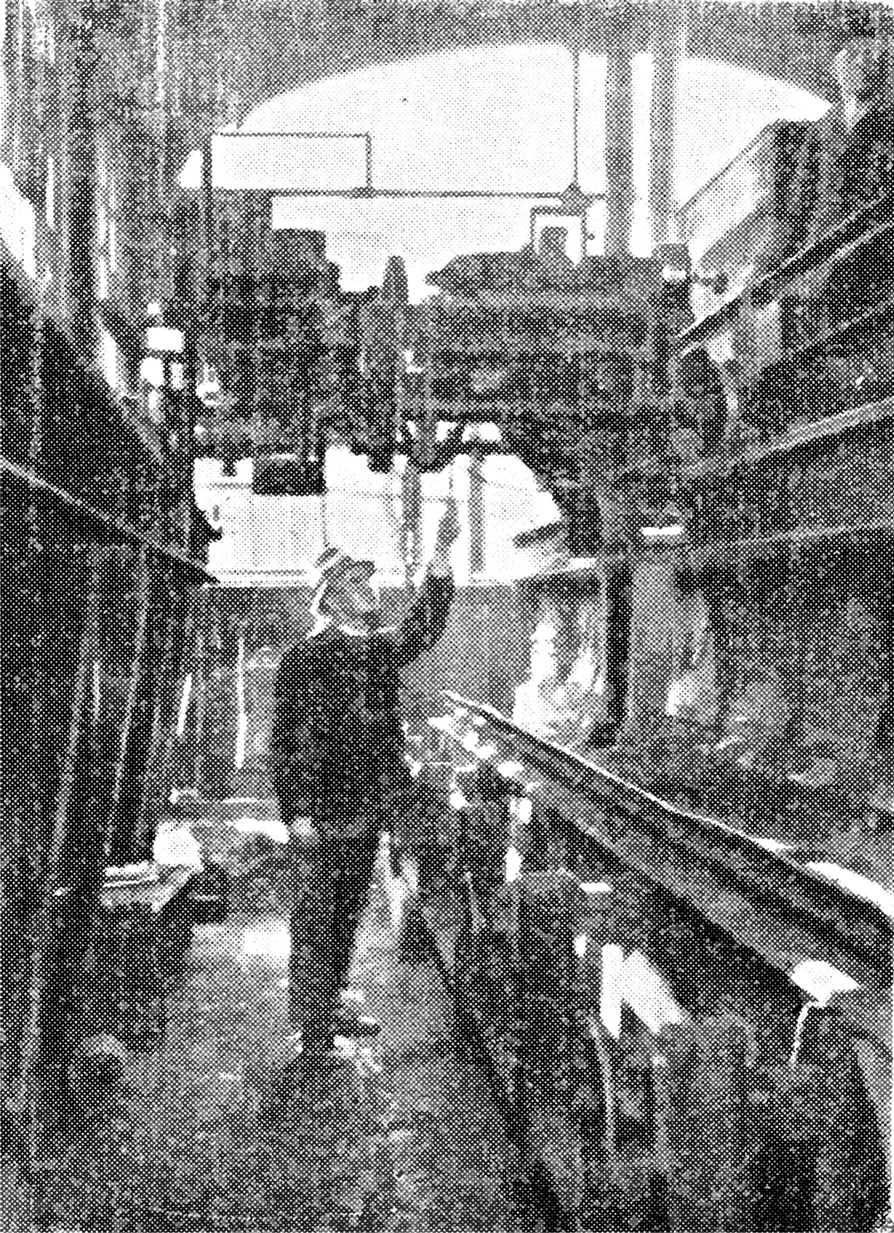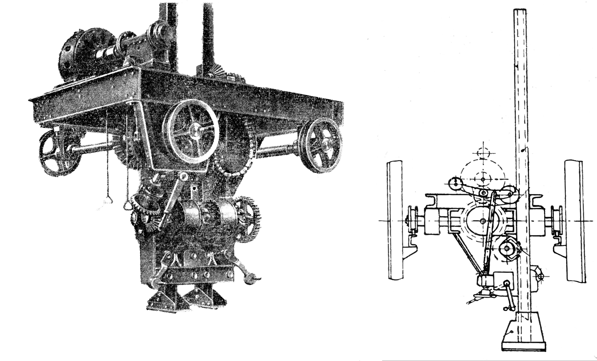 Charging machine undercarriage, travel mechanism and charging machine (photo from the "Charging Machinery of Coke Furnaces. Description and Service" study by Lesław Brodzik, p. 36 and 45, Państwowe Wydawnictwa Techniczne, Katowice, 1952)