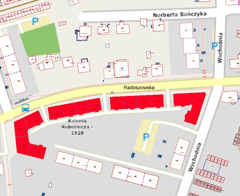 Workers' settlement located along 107-135 Radoszowska Street (odd numbers). The characteristic elements of these buildings are decorative plastered panels standing out against the background of a simple elevation made of bricks. These buildings are similar to those in “Werdon” settlement in the district of Wirek. |