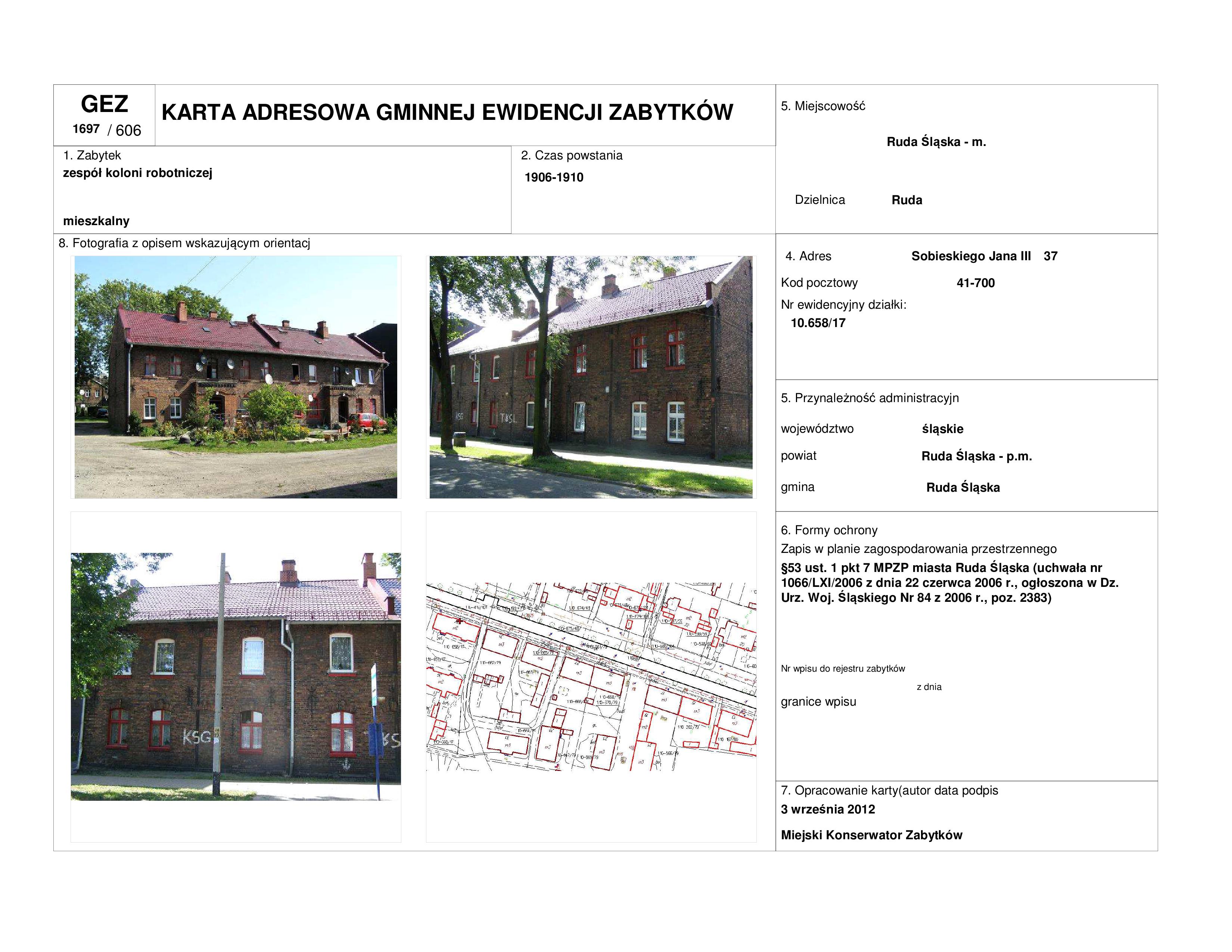 Kolonia robotnicza przy ul. Jana III Sobieskiego w Rudzie Śląskiej - przywracanie wartości architektonicznych zabytkowej zabudowy w toku postępowań administracyjnych. (artykuł autorstwa dr inż. arch. Łukasza Urbańczyka opublikowany w Wiadomościach Konserwatorskich Województwa Śląskiego nr 6 - Katowice 2014 r.) Jedną z najstarszych dzielnic Rudy Śląskiej jest Ruda. Jako miejscowość Ruda po raz pierwszy wymieniona była w Rejestrze Ujazdowskim – księdze uposażeń biskupstwa wrocławskiego. Z dokumentu tego wynika, że osada ta istniała już w latach 1295-1305, a osadnictwo rozwijało się na tych terenach jeszcze wcześniej, co potwierdza dokument z 25 kwietnia 1155 roku, wystawiony przez papieża Hadriana IV, tak zwana bulla protekcyjna dla biskupstwa wrocławskiego. Osadnictwo na tych terenach miało ścisły związek z wydobywaniem rud żelaza, skąd też wywodzi się nazwa miejscowości Ruda. Natomiast od średniowiecza do lat 20-tych XIX wieku nad rzeką Bytomką w rejonie obecnej ulicy Sobieskiego działała kuźnica, której właścicielem był Jan Gierałtowski. Od tej kuźnicy cały sąsiadujący z nią obszar został nazwany Kuźnicą Rudzką („Rudahammer”, określaną też na wcześniejszych mapach jako „Ruder Kuznitze”). Nazwa tego obszaru funkcjonuje do dnia dzisiejszego. Kiedy właścicielami Rudy w 1798 roku zostali Ballestremowie obszar ten wchodził w skład majoratu rudzko-biskupicko-pławniowickiego. Majorat (fideikommis) według dawnego prawa niemieckiego był majątkiem niepodzielnym, którego nie można było sprzedać. Były ty dobra dziedziczne przechodzące w całości na najstarszego syna, lub krewnego potomka męskiego. Na granicy Miasta Zabrza i Bytomia dla pracowników zakładów Borsiga w Biskupicach (inwestorem był zakład „Borsigwerk” – Biskupitz) przy obecnej ul. Jana III Sobieskiego w latach 1899 - 1906 powstała zasadnicza część kolonii robotniczej „Rudahammer”. Kolonia obejmowała 152 mieszkania i była wyposażona w obiekty usługowe takie jak sklep, pralnie, łaźnię czy tzw. kasyno robotnicze. Obok kasyna rozciągał się ogólnodostępny park. Kolonia powstawała etapowo. W pierwszym etapie wybudowano 26 domów mieszkalnych usytuowanych po północnej stronie drogi, a także wymienione powyżej budynki usługowe. W drugim etapie po 1906 roku powstało natomiast 12 domów mieszkalnych po południowej stronie drogi powiększając osiedle wzdłuż drogi biegnącej w kierunku Rudy. Do budowy osiedla zastosowano projekt typowego budynku 4 rodzinnego wielokrotnie stosowanego przez zakłady Borsiga na terenie Zabrza i Rudy Śląskiej. Domy mieszkalne wybudowane na podstawie tego samego projektu istnieją do dnia dzisiejszego przy ul. Szczęść Boże w Rudzie Śląskiej czy Trębackiej w Zabrzu, jednak są to mało liczne grupy. Poszczególne budynki różnią się zaś pomiędzy sobą skromnym detalem architektonicznym oraz różnego typu zwieńczeniami ścian frontowych. Przy każdym domku był ogródek i chlewik. Przez środek osiedla przebiegała bardzo szeroka jak na tamte czasy droga wyposażona w chodniki, tereny zielone oraz linię tramwajową. Budowę tej drogi rozpoczęto w 1893 roku. Była wykonana z żużla wielkopiecowego z zakładu hutniczego „Borsig” w Biskupicach i posiadała kamienną nawierzchnię. Od 1896 roku przez Kuźnicę kursował także elektryczny tramwaj wąskotorowy łączący Zabrze z Bytomiem. W centralnej części ulicy, po jej południowej stornie w sąsiedztwie parku pomiędzy 1908 a 1910 rokiem wybudowano okazały gmach szpitala Spółki Brackiej. Miejsce to wykorzystywane było jako szpital uzdrowiskowy dla pracowników zakładów górniczych.
