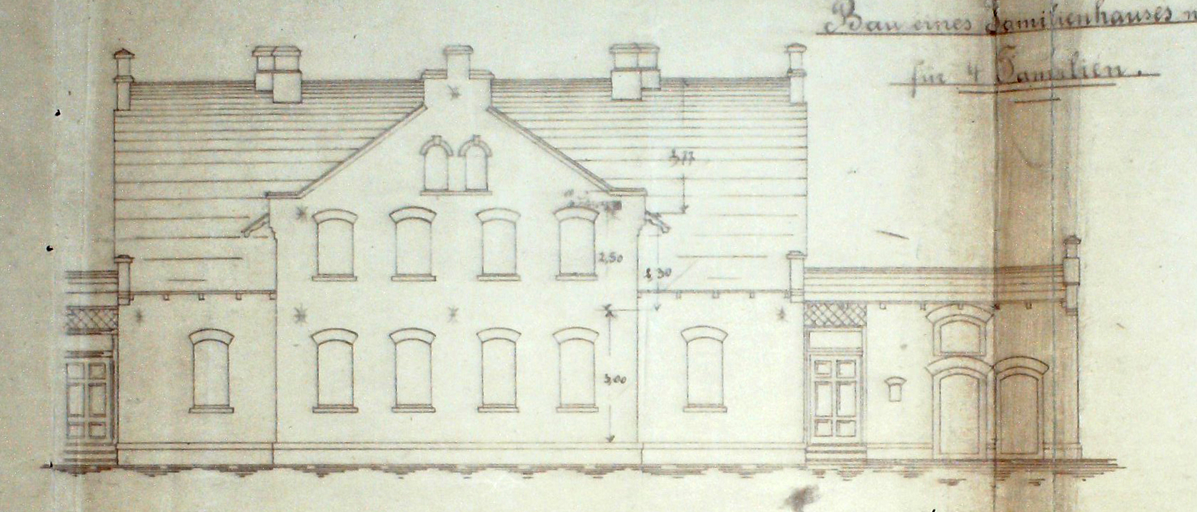 Rysunek elewacji budynku mieszkalnego z pierwszego etapu budowy. Projekt archiwalny z 1900 roku, autor projektu – podpis nieczytelny, archiwum Miejskiego Konserwator Zabytków w Rudzie Śląskiej, pozycja 290