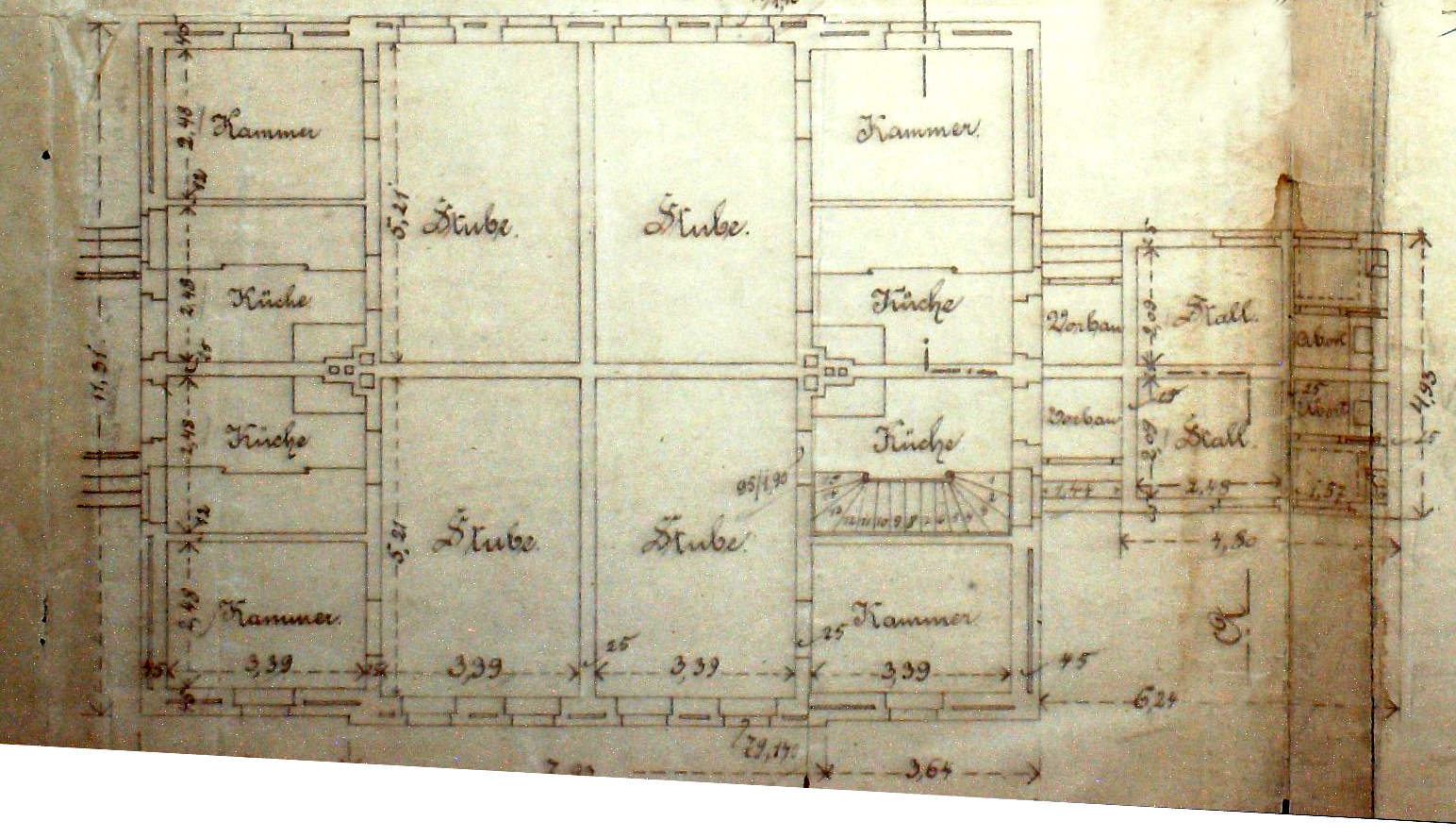 Rzut budynku mieszkalnego z pierwszego etapu budowy. Projekt archiwalny z 1900 roku, autor projektu – podpis nieczytelny, archiwum Miejskiego Konserwator Zabytków w Rudzie Śląskiej, pozycja 290