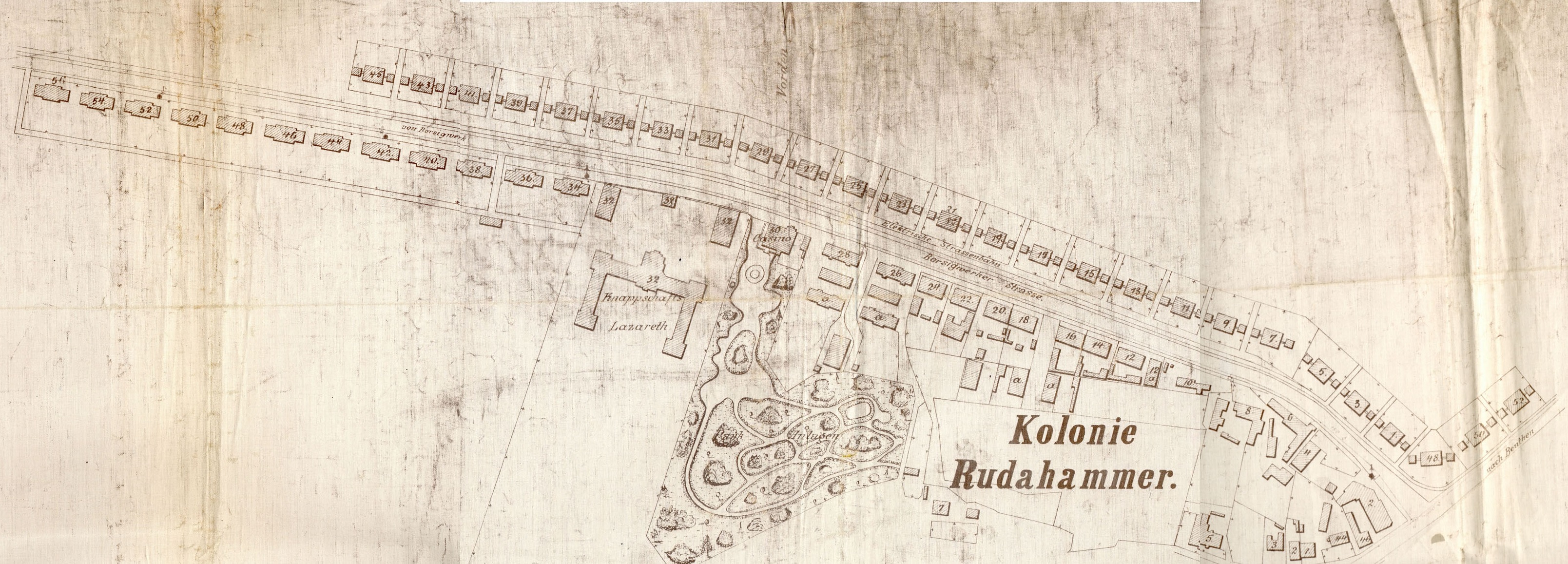 Mapa kolonii Rudahammer z 1916 roku stanowiąca fragment załącznika mapowego do pozwolenia na budowę instalacji wodociągowej pomiędzy koloniami Rudahammer, a kolonią Karol, archiwum Miejskiego Konserwator Zabytków w Rudzie Śląskiej